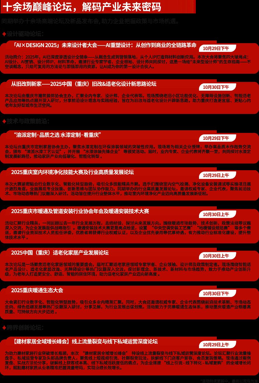 展会期间,组委会将联合行业协会、权威媒体及头部企业,举办10余场专题论坛,紧扣产业趋势、产品走向、旧改局改、以旧换新、适老家居、出海贸易、设计师活动、整装快装、新媒体营销等核心议题,汇聚50+位行业领袖、学术专家与先锋设计师,通过主题演讲、圆桌对话、案例剖析等形式,深度解析政策红利、技术趋势与市场机遇,为行业提供从战略到落地的全景式洞察。
