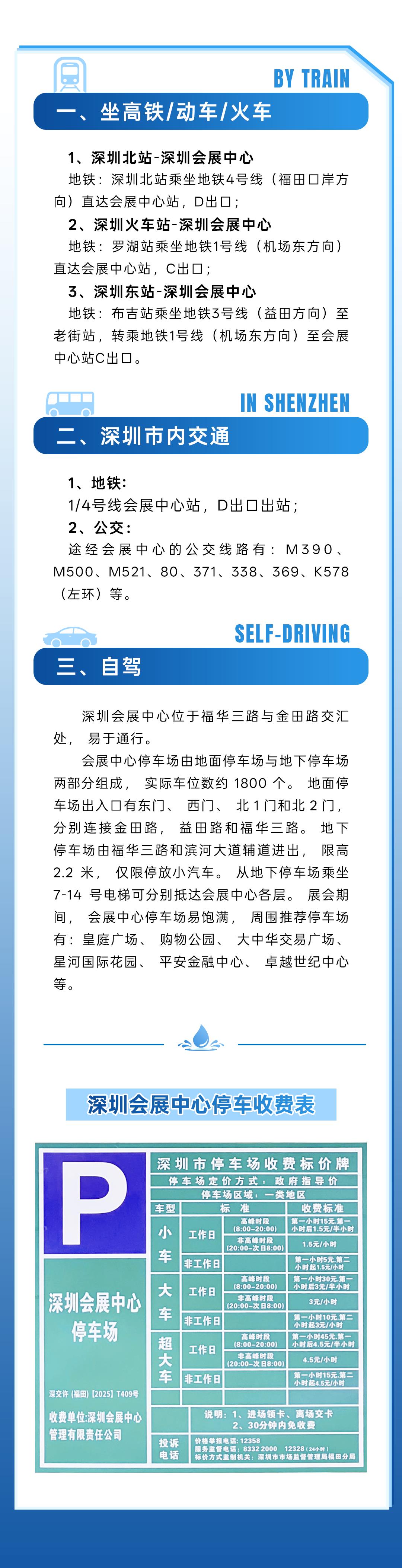 展会期间,会展中心停车场易饱满,周围推荐停车场有:皇庭广场、购物公园、大中华交易广场、星河国际花园、平安金融中心、卓越世纪中心等。