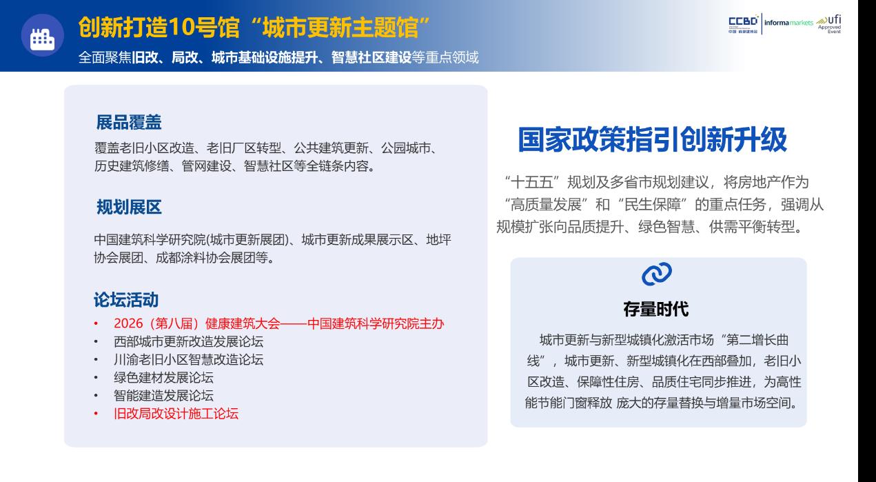 城市更新已成为驱动城市可持续发展的核心引擎。川渝地区存量房市场规模突破10亿平方米,旧改、局改政策持续落地,释放出巨大市场潜力。2026中国成都建博会精准把握这一战略机遇,倾力打造10号馆城市更新主题馆,聚焦旧城改造、局部更新、城市基础设施提升、智慧社区建设四大核心领域,为产业链上下游企业搭建起对接中西部市场的专业桥梁。