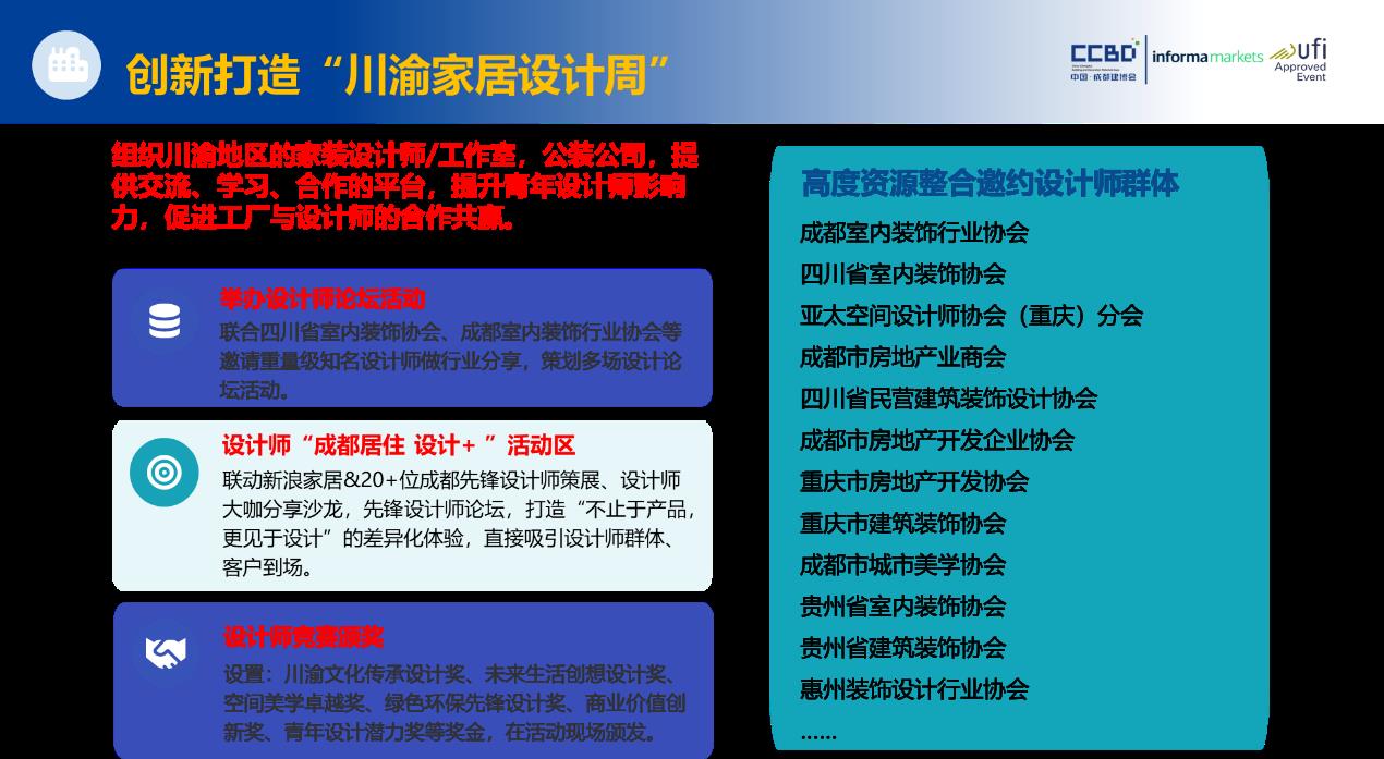 设计重塑空间,美学赋能产业。作为“设计之都”,成都汇聚了西南地区67%的知名设计机构,创意资源富集。2026中国成都建博会创新打造“川渝家居设计周”,联合重庆市建筑装饰协会、亚太设计师协会重庆分会、成都市建筑装饰协会、四川省室内装饰协会、成都室内装饰行业协会等权威机构,策划多场设计主题展与专业论坛,推动设计价值向产业价值高效转化。